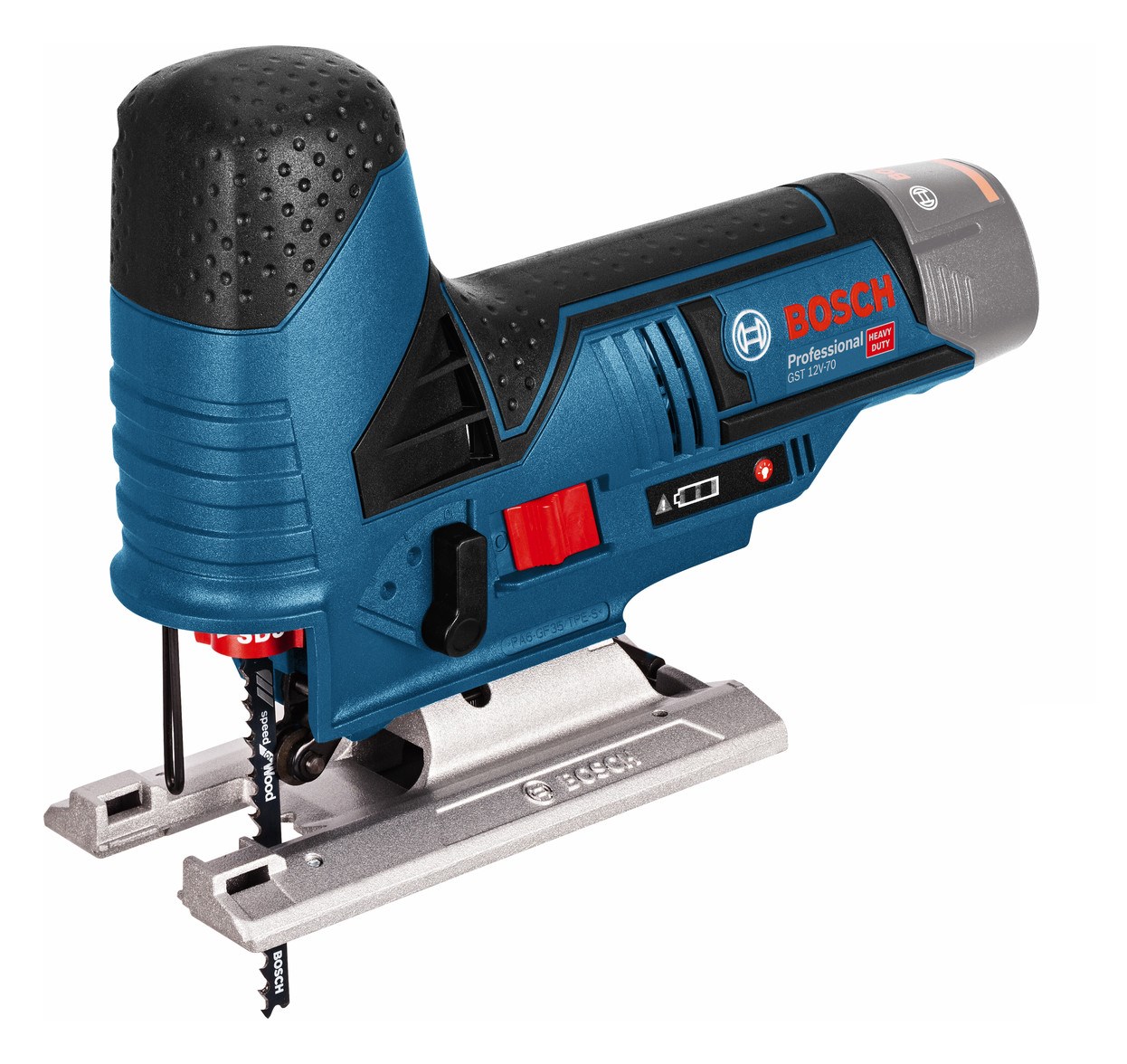 Akku-Stichsäge GST 12V-70. Kompakte Stichsäge in Stabform im 12-Volt-Segment. Stabform. Kompaktheit und Leichtbauweise sorgen für bestmögliche Wendigkeit selbst bei Schnitten von unten. Griff der Stichsäge extrem nah an der Schnittlinie, was für eine perfekte Handhabung während der Benutzung sorgt. Werkzeugloses Bosch SDS-System für problemlose Sägeblattwechsel. Optimierte Bauform für komfortables Sägen von unten. Besonders geringer Griffumfang für komfortables und ermüdungsarmes Arbeiten. Robuste Aluminiumfußplatte mit Kunststoffsohle für bessere Gleiteigenschaften und zum Schutz empfindlicher Oberflächen. Hervorragende Sicht auf die Schnittlinie dank zuschaltbarer, heller LED. Electronic Motor Protection (EMP) schützt den Motor vor Überlastung und sorgt für lange Lebensdauer. Bosch Electronic Cell Protection (ECP): Schützt den Akku vor Überlastung, Überhitzung und Tiefentladung. Ergonomischer Stabgriff mit großflächigen Softgrip-Auflagen für komfortables Arbeiten. 3-Stufen-Pendelung für ausrissfreie Schnitte. Akku und Ladegerät nicht im Lieferumfang enthalten. Solo Version, Absaug-Set, Gleitschuh, L-BOXX 102 (1 600 A00 1RP), L-BOXX-Einlage, Spanreißschutz, 1 x Stichsägeblatt T 144 D, Speed for Wood (separat erhältlich als 3er-Pack: 2 608 630 560), 1 x Stichsägeblatt T 308 B, Extra-Clean for Wood (separat erhältlich als 3er-Pack: 2 608 663 750).