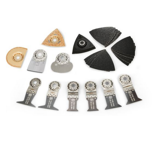 26-teiliges Zubehör-Set für alle anstehenden Renovierungsarbeiten. Passend für alle FEIN Multitools sowie alle anderen gängigen Multitools mit Starlock-Aufnahme. Im Set mit attraktivem Preisvorteil gegenüber Einzelbezug. Inhalt: 6 E-Cut Long-Life Sägeblätter (je 2 St. 50 x 35 mm, 50 x 50 mm, 50 x 65 mm), 1 Hartmetall-Raspel (80 mm), 1 Hartmetall-Segmentsägeblatt (Ø 75 mm, 2,2 mm), 1 fester Spachtel, 1 Schneidmesser (Pilzform), 1 Schleifplatte, ungelocht (80 mm), je 5 Schleifblätter (K 60, 80, 120).