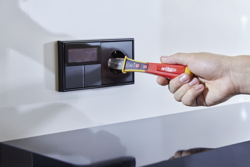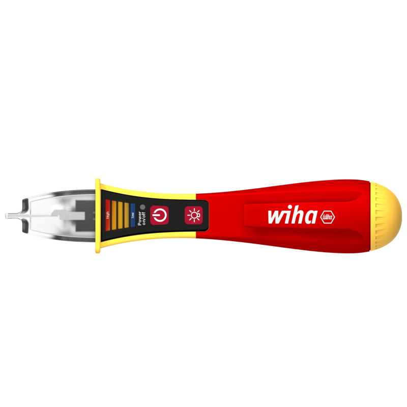 Vor Beginn einer Elektroinstallation müssen Elektriker gewährleisten, dass das Arbeitsumfeld spannungsfrei ist. Um elektrische Wechselfelder testen oder mutmaßliche Fehlerquellen orten zu können, wird ein Spannungsprüfer benötigt. Eine erste Indikation, ob Spannungsfreiheit vorliegt, ist mit dem berührungslosen Wiha Spannungsprüfer dank optischem und akustischem Signal möglich. Nach dem Einschalten zeigt die permanent grün leuchtende LED die Funktionsbereitschaft an. Bei der Spannungsprüfung leuchten je nach Stärke des elektrischen Wechselfeldes die LEDs von blau (schwach) über orange bis hin zu rot (stark). Für die Benutzung werden zwei AAA Batterien benötigt, welche im Lieferumfang enthalten sind. Wird das Gerät 4 Minuten lang nicht verwendet, schält es sich automatisch aus um Energie zu sparen. Eine integrierte LED Taschenlampe ermöglicht die Messstellenbeleuchtung in dunkler Umgebung und kann durch manuelles Ein- und Ausschalten als Taschenlampe verwendet werden. Der Spannungsprüfer mit Ansteckclip passt dank seiner handlichen Größe bequem in jede Hemd- und Hosentasche. Dank der international angepassten Messspitze ist der Spannungsprüfer für alle Steckdosenvarianten weltweit geeignet. Der einpolige Spannungsprüfer unterliegt der Norm EN 61010-1 / IEC 61326 und ist ausgelegt für CAT IV 1.000 VAC.