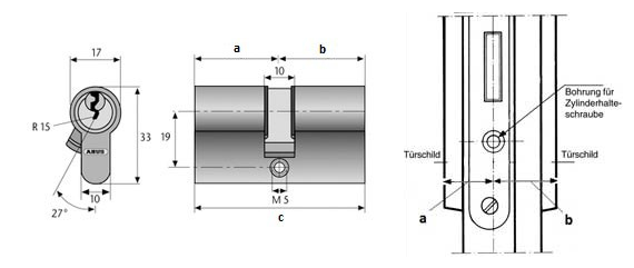 Die für Sie passende Zylinderlänge ist von der Türstärke und der Beschlagdicke abhängig. Das richtige Maß können Sie an Ihrer Türe abmessen. Die gemessenen Maße A und Maße B (siehe letzte Skizze) ergeben die benötigte Zylinder-Länge. Bitte beachten Sie, dass der Türzylinder nicht mehr als 3 mm über den Beschlag überstehen sollte, da er sonst Angriffsfläche für Werkzeuge bietet. Wie Sie die Länge von Zylindern genau vermessen, können Sie in unserem Blog-Artikel nachlesen.