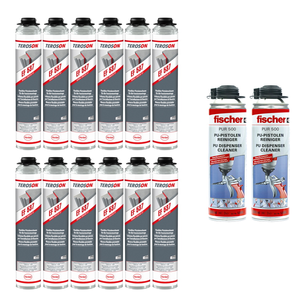 12x Teroson 1-K Pistolenschaum 750ml EF 537 + 2x Fischer PU- und Pistolenreiniger PUR 500ml – Set für professionelle Montagen