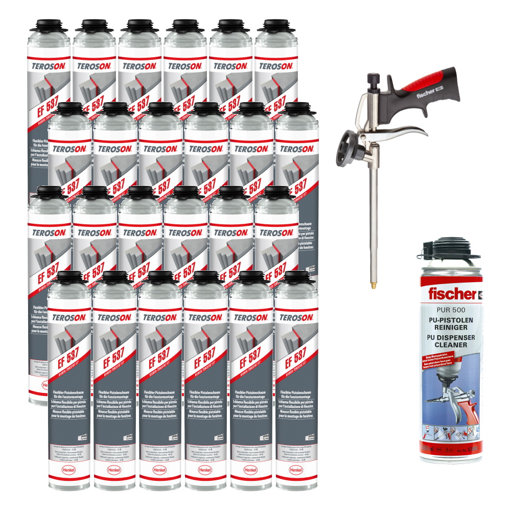 24x Teroson 1-K Pistolenschaum 750ml EF 537 + 1x Fischer Metallpistole PUP M3 + 1x Fischer PU- und Pistolenreiniger PUR 500 ml – Set für professionelle Montagen